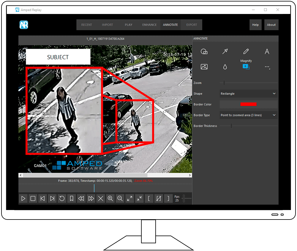 Amped Replay also provides basic correction, redaction, and annotation tools to allow police investigators to clarify details and present professional and polished results, whether they are being used as part of a case, forwarded to another unit or intelligence analyst, or sent to the media for identification.