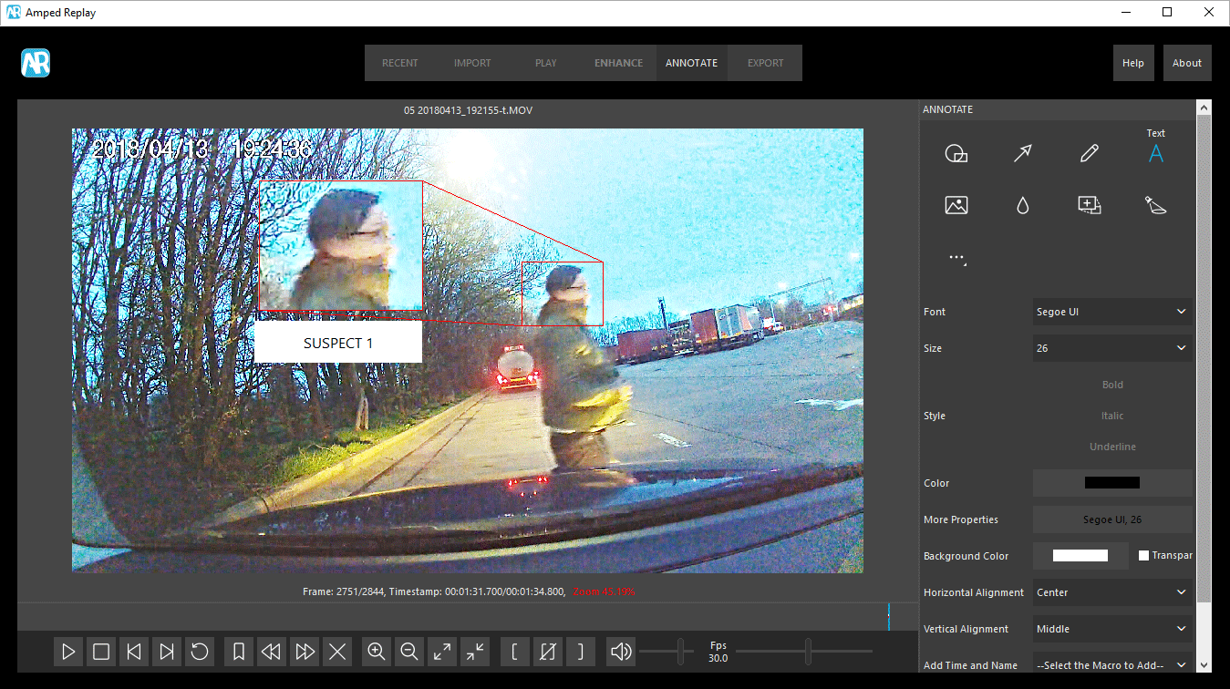 Amped Replay also provides basic correction, redaction, and annotation tools to allow police investigators to clarify details and present professional and polished results, whether they are being used as part of a case, forwarded to another unit or intelligence analyst, or sent to the media for identification.